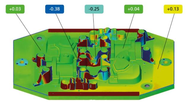 Wilhelm Funke选择使用搭配ZEISS INSPECT软件的自动化设备SCANBOX进行自动检测和数字化处理。高精度和可溯源的测量结果确保了即使是微小的偏差也能快速识别,从而在必要时可快速采取应对措施。工具和模型通过与CAD数据进行彩色表面对比,进行了有针对性的校正。此外,还要检查半模、型芯和滑块的配合情况。在试模过程中,计量人员会检查铸件的形状和尺寸精度。在比较部件时,高检测重复性至关重要。